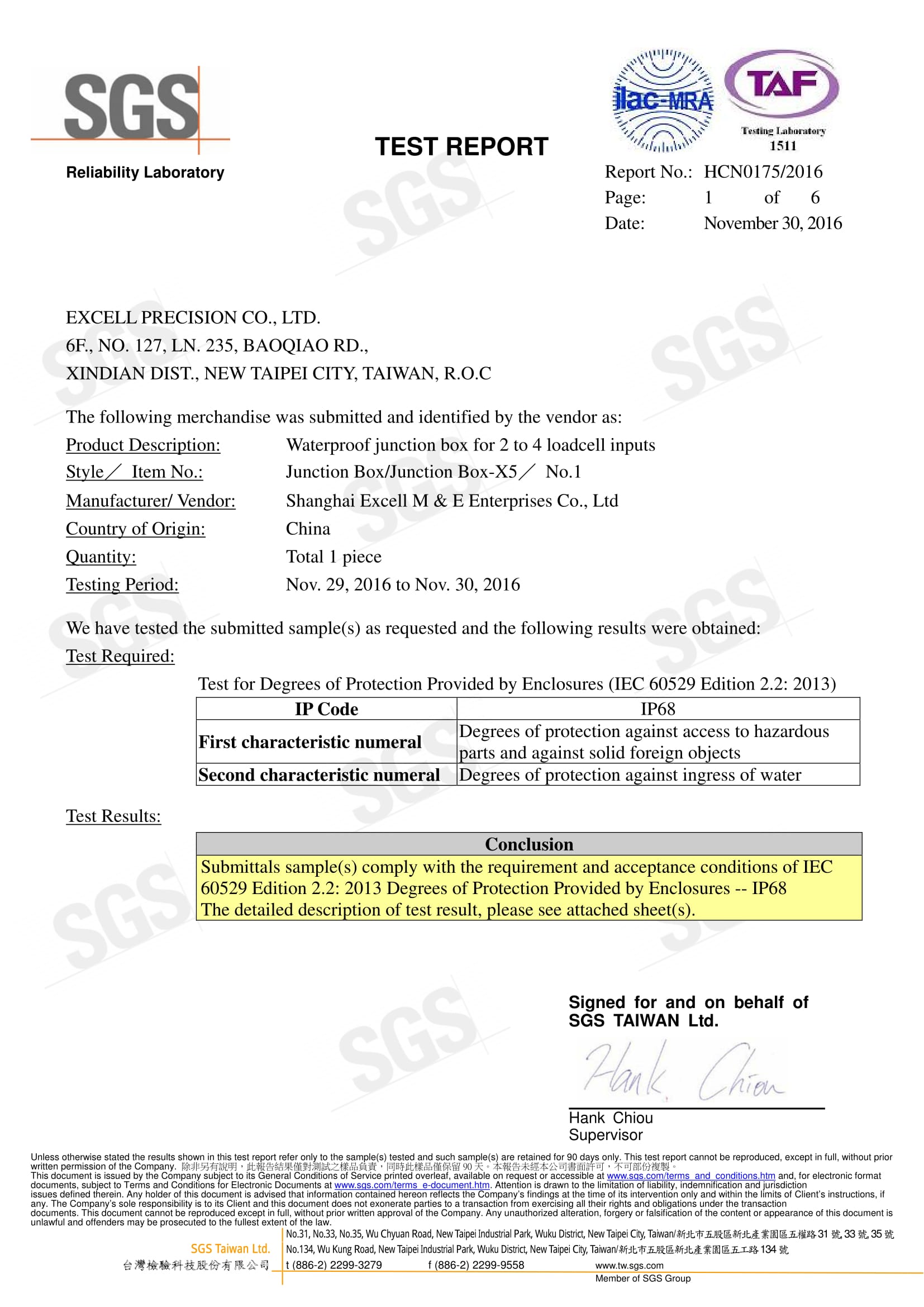 Giấy Chứng Nhận SGS Cho Hộp Nối Chống Nước EXCELL