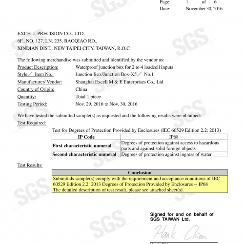 Giấy Chứng Nhận SGS Cho Cân Chống Nước EXCELL